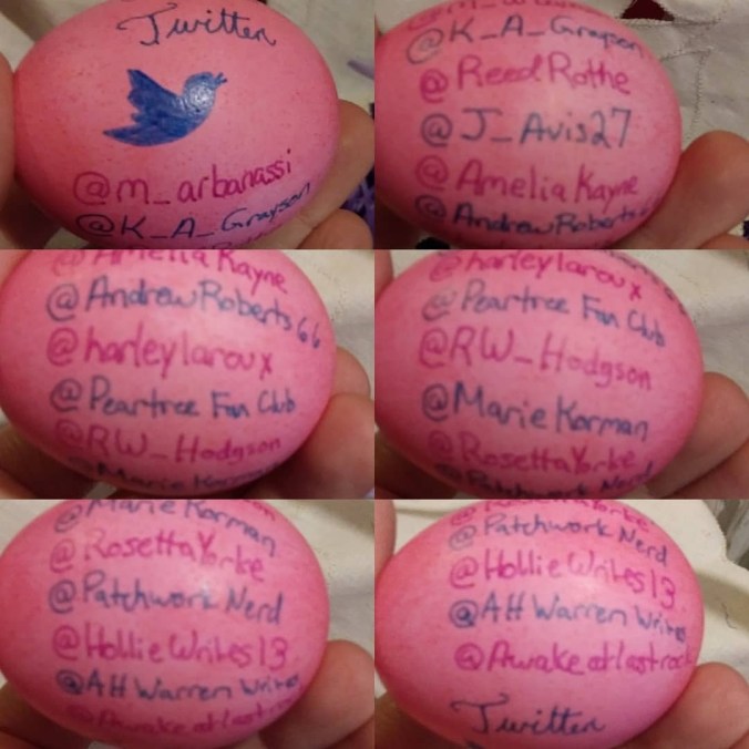 #eastereggmarketing close up 11- It’s #FF! #AprilFools, even if this is the *long* list of my favorite people, written down on an egg… See if you’re #tagged? #HappyEaster with hashtag Easter eggs!