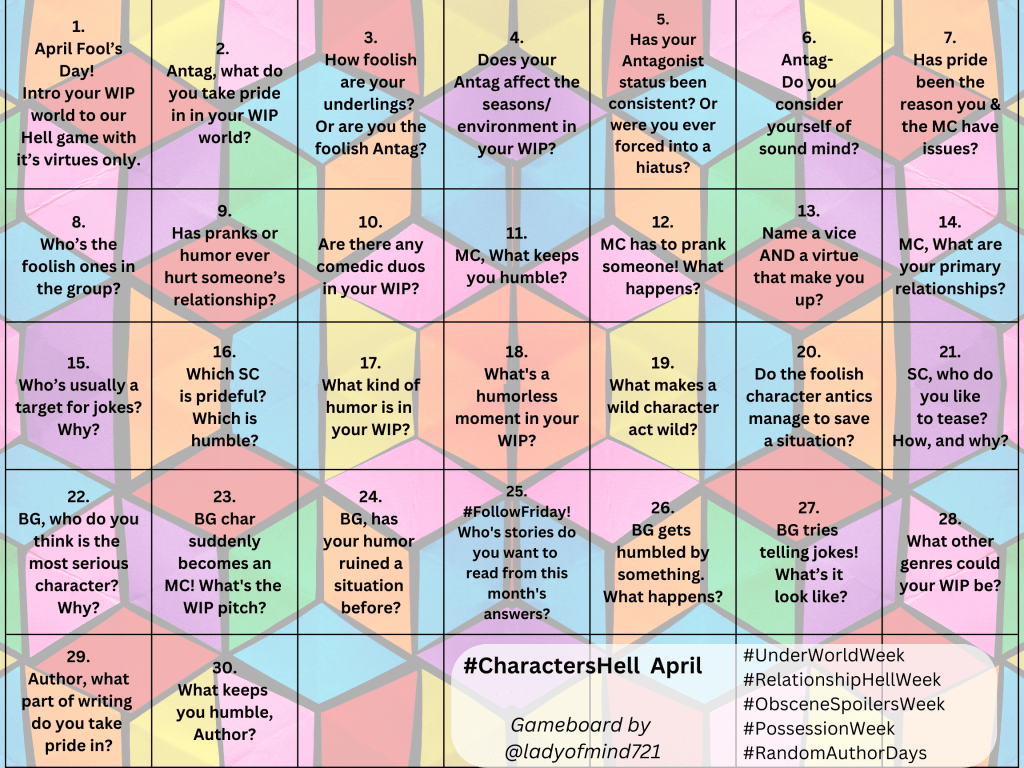 So here’s the first board of Characters Hell launching for April Fool’s Day. I encourage anyone with a WIP to come play the game again.