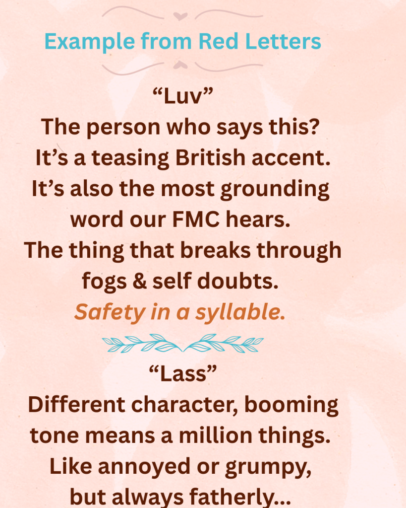 My examples are of course from Red Letters, at least this week, as you all have seen enough of the voices to hear them in your heads too. Frost booms lass in so many tones that it’s its own one word language. You know if you’re in trouble or if you’re just needed by the way that word comes out. And, because he usually shouts it at the little lasses he thinks of as daughters, it’s always fatherly, or at least forgiven if they sass him back first…