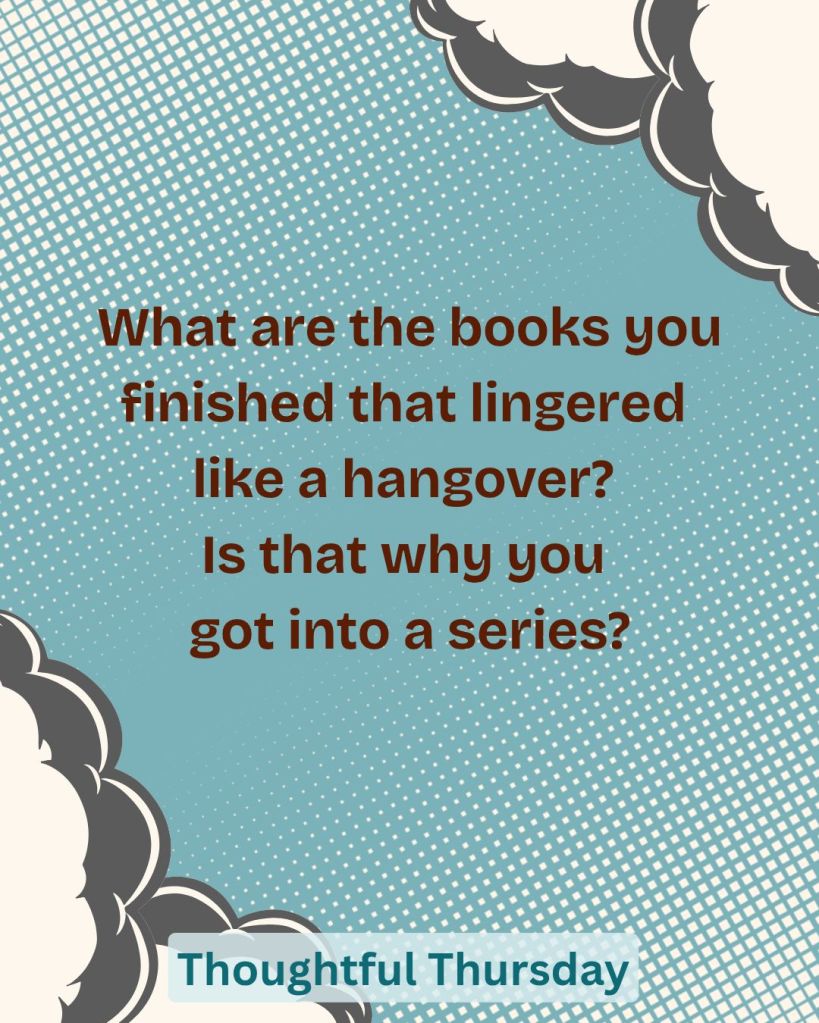 So, today’s Thought for Thursday is about Book Hangovers. That feeling when you read a book’s ending, close the book, but it’s still with you. It’s in your head for days. The character voices, the humor, the emotion, or even the unanswered parts or elements that upset you. This book, those words on a page, spun enough magic to linger with you.