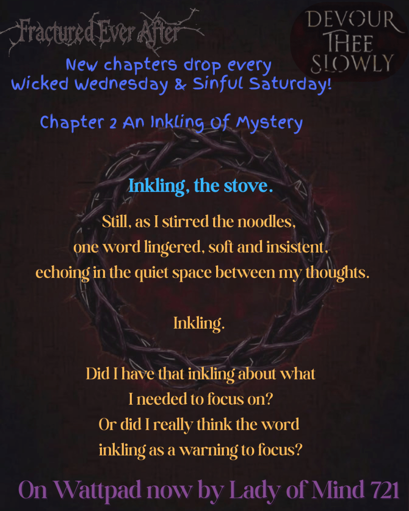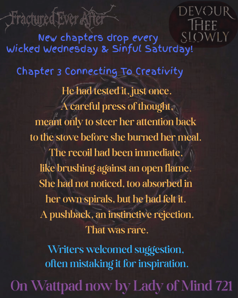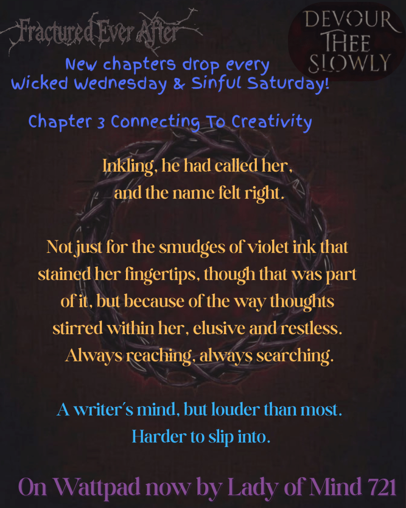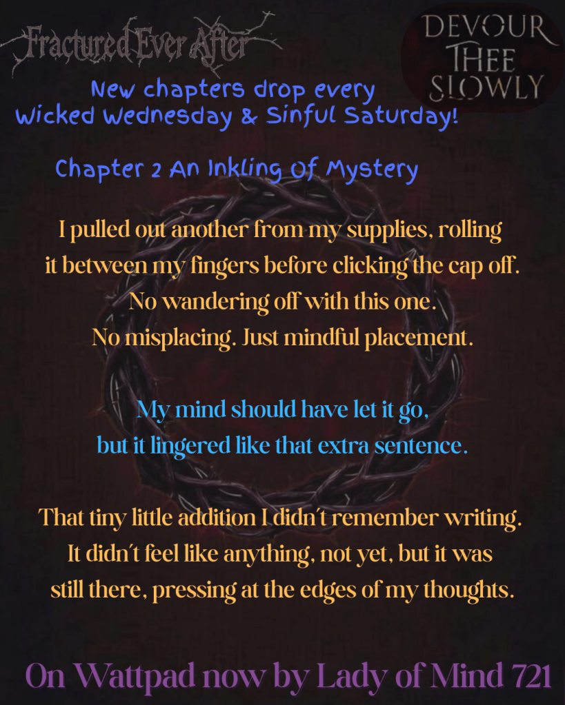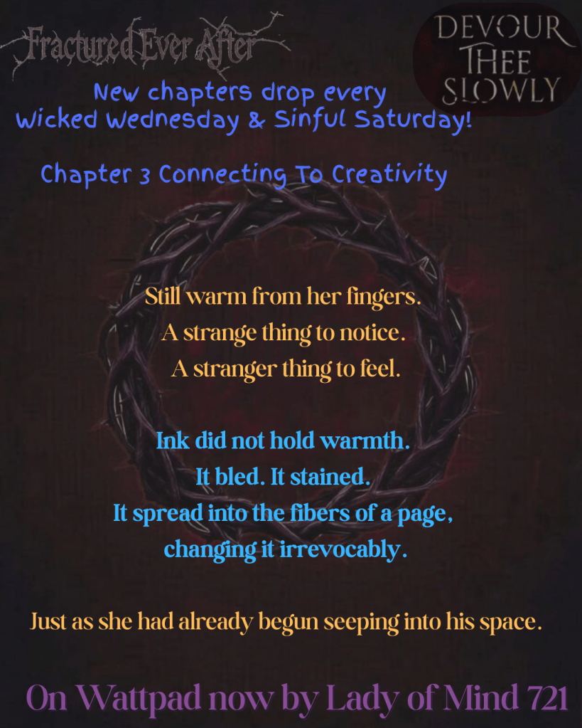 I already uploaded the first 5 chapters of Devour Thee Slowly, book one of the Fractured Ever After series on Wattpad. Saturdays posts are in the morning, and I am still playing a bit of quote catch up here, in case you missed something.