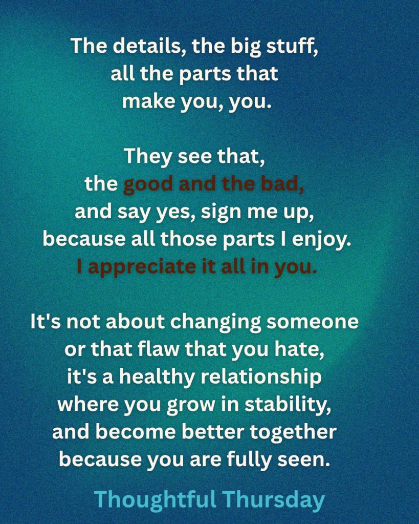 I think, movie wise, it might be snarky but the end of When Harry Met Sally comes to mind. Things like that confession, even down to the “I love that you get that little crinkle in your forehead when you think I’m crazy” kinda of moment. That’s the kind of appreciation I mean. The details, the big stuff, all the parts that make you, you. And they see that, the good and the bad, and say yes, sign me up, because all those parts I enjoy. It’s not about changing someone or that flaw that you hate, it’s a healthy relationship where you grow in stability, and become better together because you are fully seen.