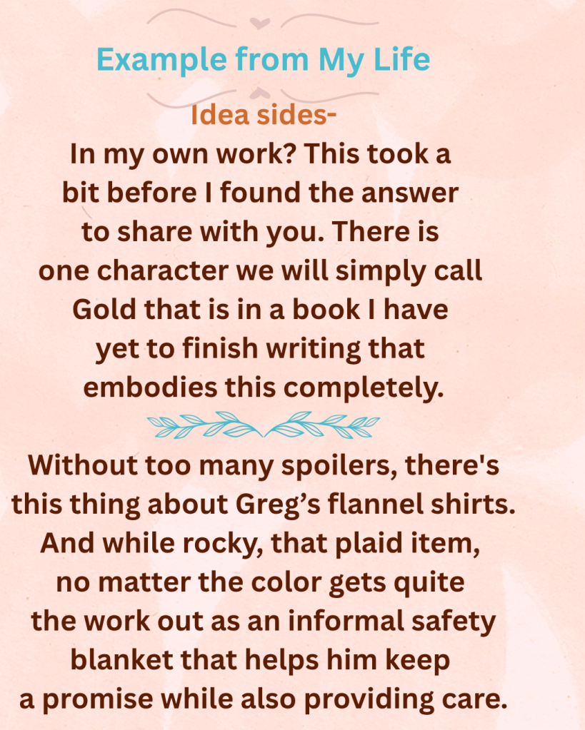 In my own work, this took a bit before I found the answer to share with you. There is one character we will simply call Gold that is in a book I have yet to finish writing that embodies this completely. But in a character I can share? After I made a mental note for more characters with this kind of sweetly unnoticed intent, I knew I had to talk about Red Letters Greg again. Without too many spoilers, there’s this thing about his flannel shirts. The first time we meet him, Greg leaves a plaid behind with the promise to come return for it, and by implied extension, one of our characters. And while rocky, that plaid item, no matter the color gets quite the work out as an informal safety blanket that helps him keep a promise while also providing care. Because, who doesn’t want a special flannel wrap and catch that technically follows the rules of their situation but also pretty much breaks them apart too. And ok, maybe the ease with which Greg gives away his flannel is why it’s so easy to get that lady in that story to wear it without asking her to? What are your thoughts, and what have you guys got?