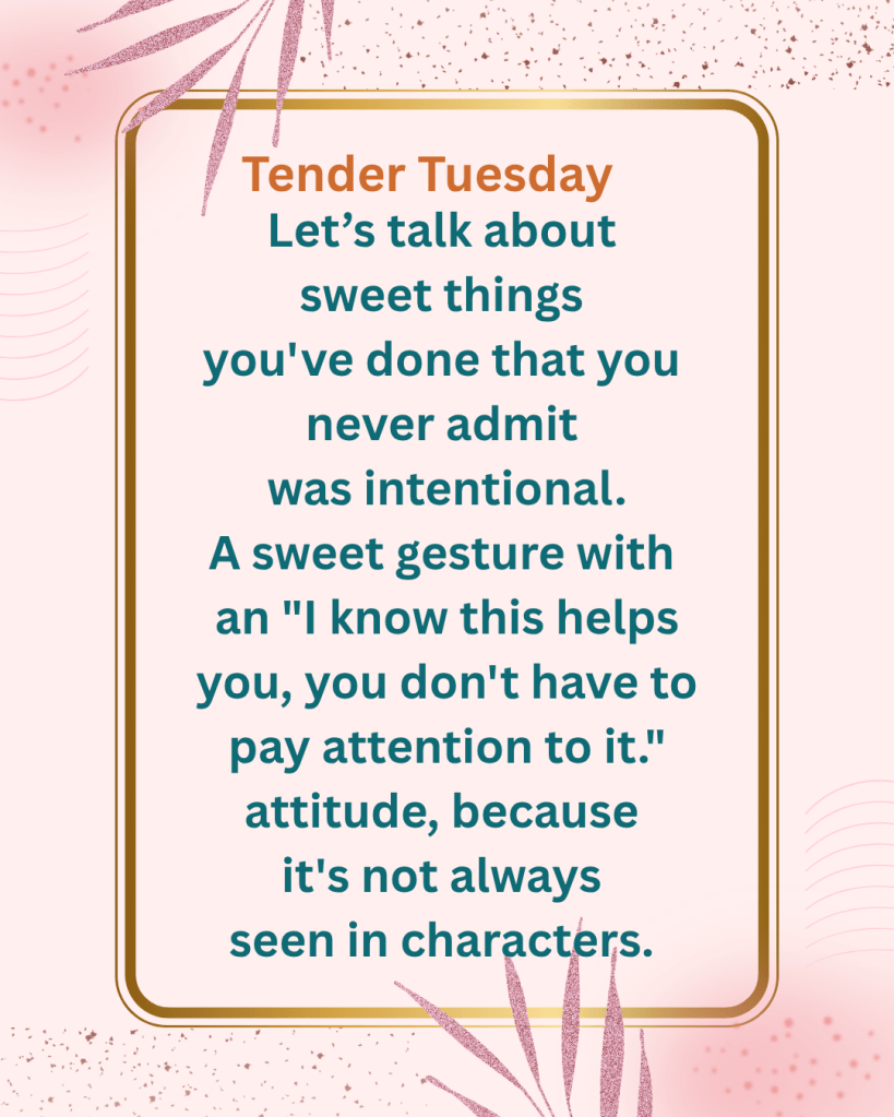 Accidentally on purpose is just another way to say a fortunate outcome to your intent that didn’t seem like it could end well. So for a tender day, I want to talk about sweet things you’ve done that you never admit was intentional. Like getting that “how did you know I needed this?” when you showed up with a drink or a snack. It’s a weird question to ask, but it’s a good one to consider for writers and readers alike. A sweet gesture with an “I know this helps you, you don’t have to pay attention to it.” attitude, because it’s not always seen in characters.