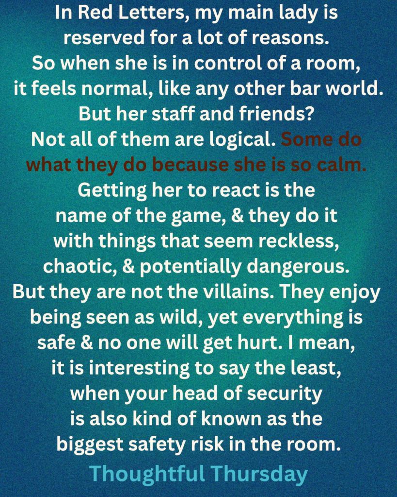 In Red Letters, my main lady is reserved for a lot of reasons. She is social but distant, mysterious in that open about everything but herself way. So when she is in control of a room, it feels normal, like any other bar world. But her staff and friends? Not all of them are logical. Some do what they do BECAUSE she is so calm. Getting her to react is the name of the game, and they do it with things that seem reckless, chaotic, and potentially dangerous. But they are not the villains. They enjoy being seen as wild, yet everything is safe and no one will get hurt. In most cases, the ones in the crazy situation even volunteer to be a part of the show. I mean, it is interesting to say the least, when your head of security is also kind of known as the biggest safety risk in the room. But that’s just a personality and an entertainingly random thought process, not an actual harm thing. The lines blur, but you don’t doubt that the chaotic agents would step up and save the day. Some would just do it their own comedic way.